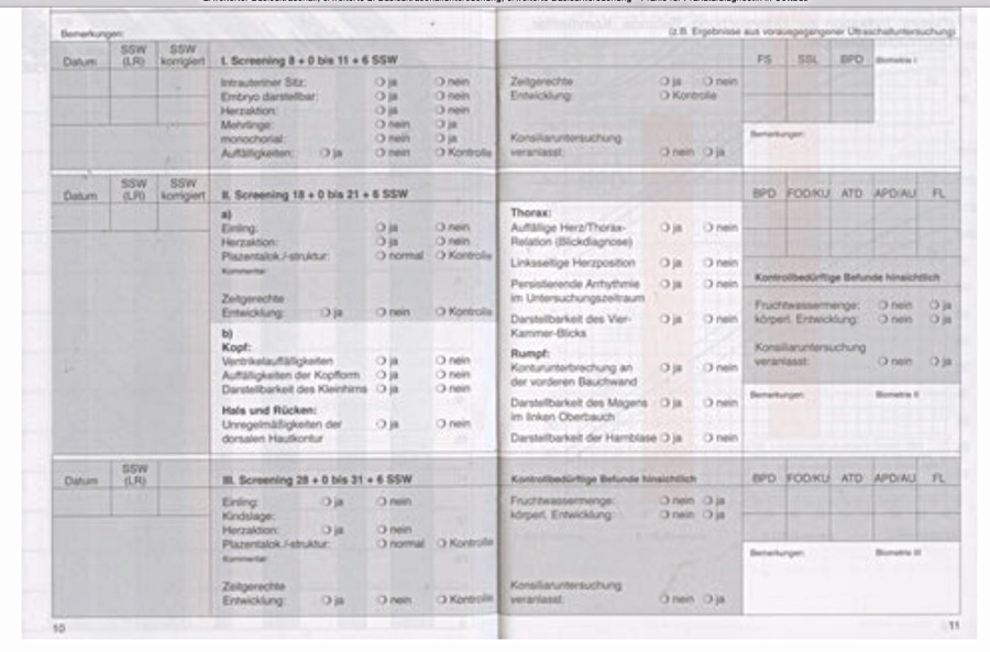 Hierbei handelt es sich um die erste Basis - Ultraschall Untersuchung nach den Mutterschaftsrichtlinien (MuRL). Es werden 6 grundsätzliche Punkte beurteilt, ein Wert wird gemessen: